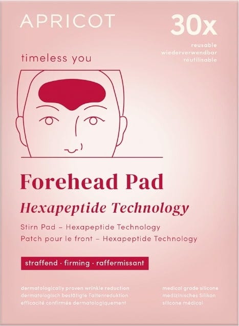 The APRICOT forehead pad with hexapeptide was specially developed for the care of the forehead area and can be easily integrated into your beauty routine. The formula with hexapeptide complex supports a nourished skin feeling and a noticeably smoother complexion in no time at all. The pad is made from medical-grade silicone. It can be reused up to 30 times.