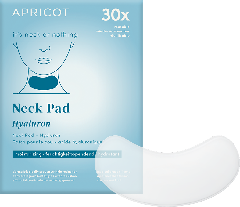 This anti-ageing neck pad made of medical-grade silicone by APRICOT provides the skin on the neck with long-lasting moisture. Low-molecular hyaluronic acid is absorbed deep into the skin and provides intensive nourishment. The pads can be reused up to 30 times.
