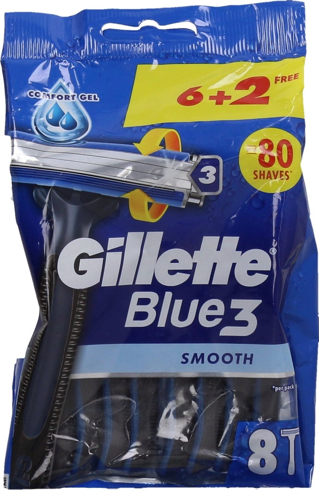The Gillette Blue3 disposable razors ensure perfect shaving results thanks to three long-lasting skin sensor blades and a 40° swivel head that adapts ideally to all contours. A moisture strip, which is activated with water, allows the blades to glide cleanly and gently over the skin. The ribbed handle also allows you optimal control and safe handling.