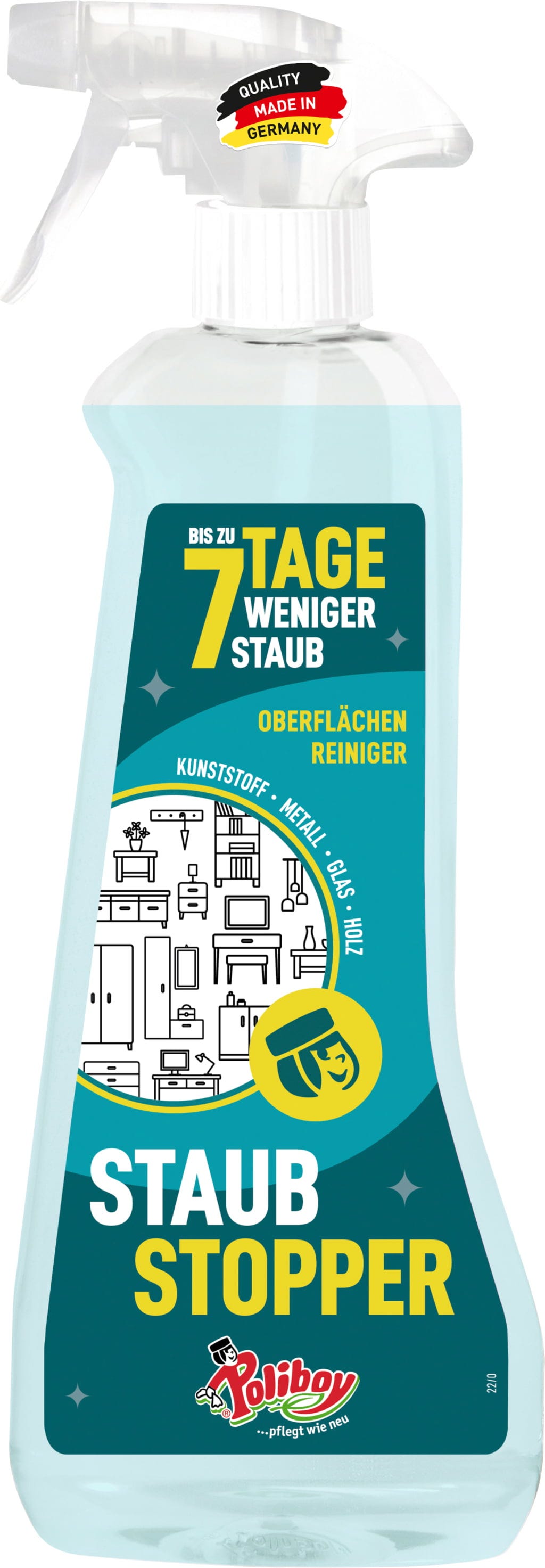 The Dust Stopper by Poliboy is a universal cleaner that reliably removes everyday dirt and reduces dust deposits thanks to its anti-static effect. It is suitable for use on painted wood, glass, chrome, enamel, ceramic, plastic and metal, keeping furniture, chairs, glass tables and decorative items streak-free and clean. The cleaner leaves behind a long-lasting fresh fragrance.
